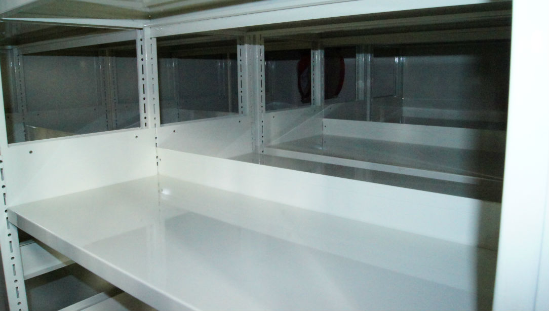 Steel Shelving within NUTECH Mechanical Mobile Compactor is epoxy coated with the option. Each level is adjustable as your business grow as NUTECH compactor designs is modular.